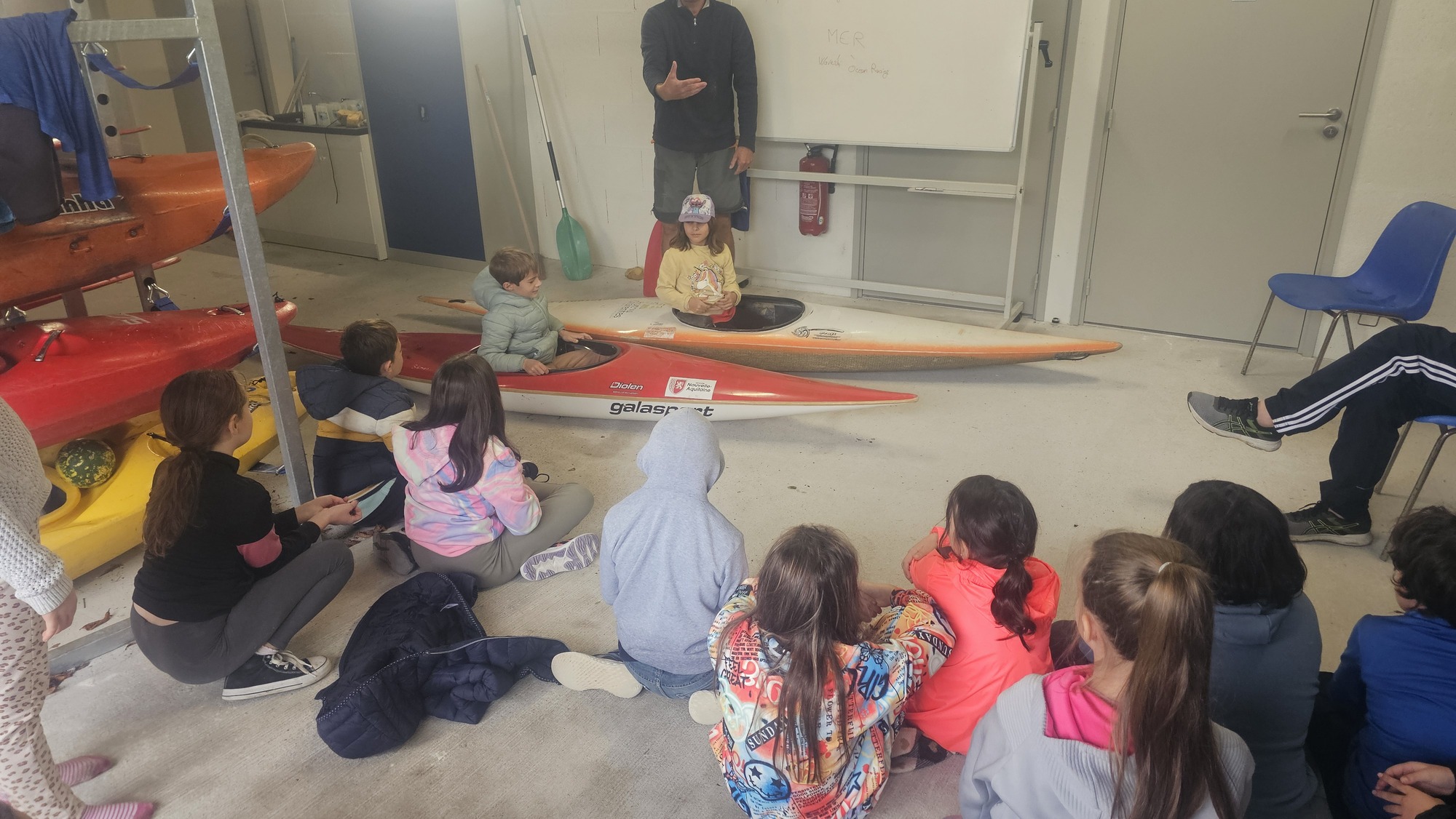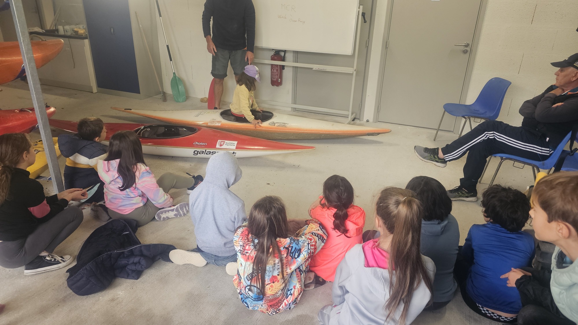L’après-midi, nous sommes restés au club, et Simon a notamment pu fièrement présenter son kayak à ses camarades, faisant partie du club. Nous avons pu évoquer les différentes formes des kayaks selon leurs modalités d’utilisation : slaloms, vitesse, eau douce, eau vive, mer...