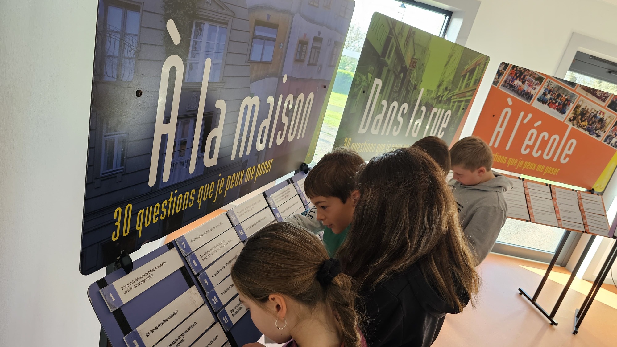 L’intervenante a présenté aux élèves trois panneaux sur lesquels ils ont été invités à choisir une question pour laquelle ils souhaitaient obtenir des explications ou des réponses. Trois grands thèmes étaient à leur disposition : les droits et obligations à l’école, à la maison et dans la rue.
