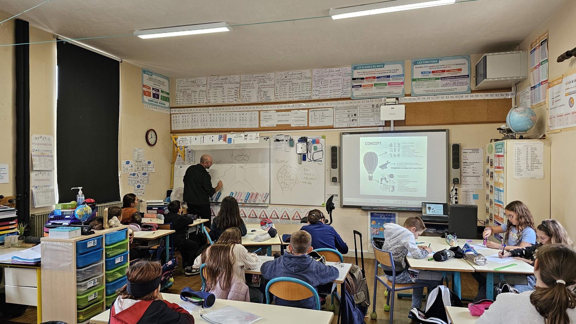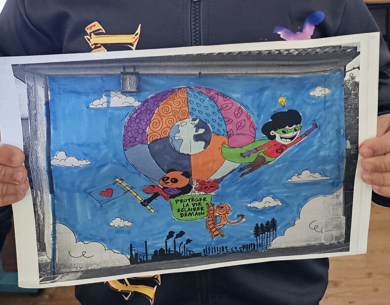 Par ailleurs, il a présenté le projet de réalisation d’une fresque sur les murs de l’école et pour laquelle, il a sollicité chacun d’entre eux pour émettre des idées de ce qu’ils aimeraient voir apparaitre sur l’illustration finale. Le thème, étant lié au développement durable, ils devaient penser à des espèces animales menacées par le réchauffement climatique, à un symbole à faire figurer sur le costume du superhéros, à choisir comment vêtir ce même Bobby (masque ou non, gants, bottes...) et quels motifs graphiques appliquer sur la montgolfière participant au sauvetage de ces êtres vivants peuplant notre planète bleue. Les élèves ont particulièrement été investis dans leur mission.
