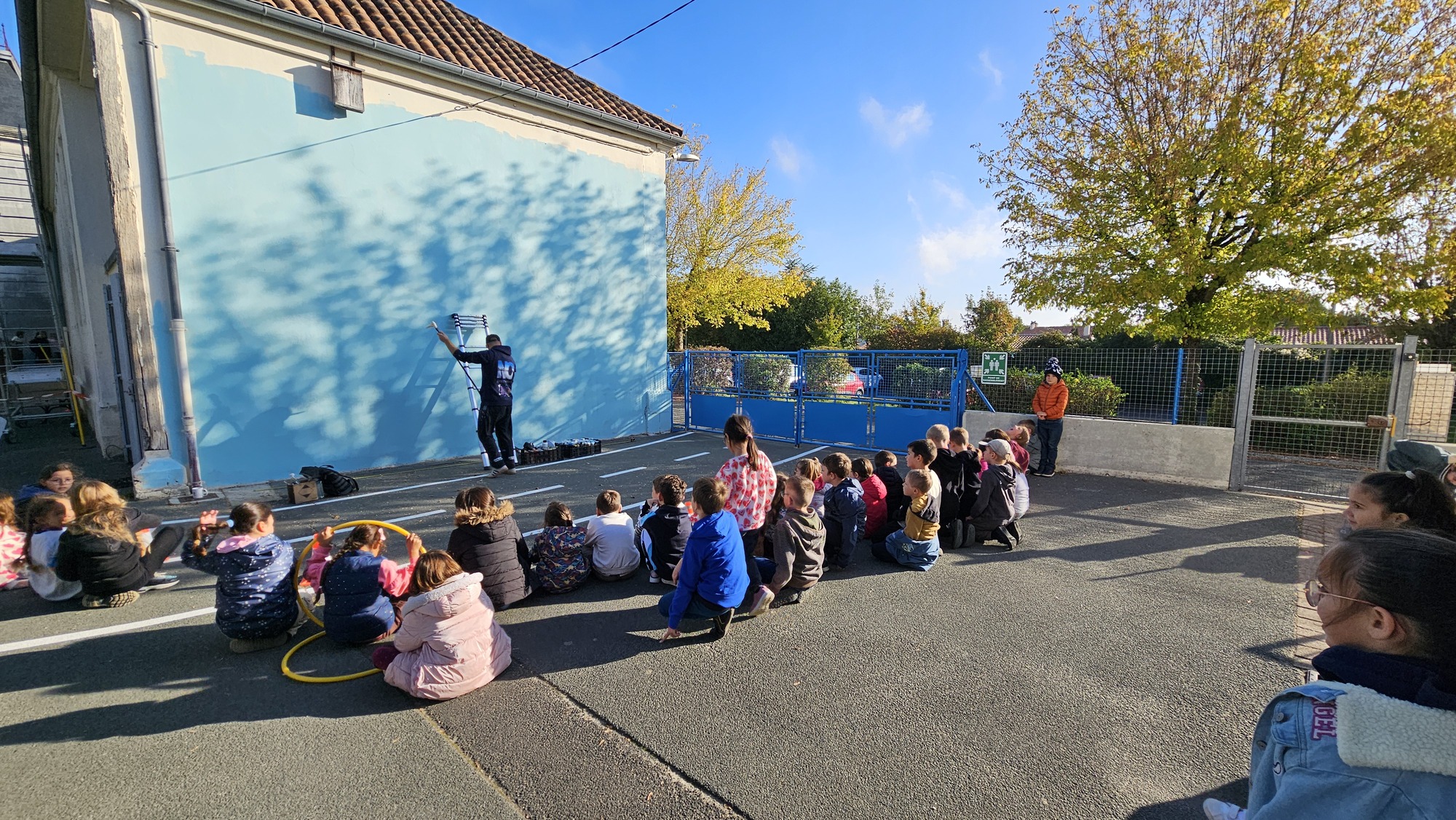Depuis quelques jours, les travaux ont débuté et le moins que l’on puisse affirmer, c’est que l’ensemble des élèves de l’école sont particulièrement intéressés et impressionnés par le talent de cet artiste. Ils sont curieux de connaitre sa façon de procéder et ils l’encouragent dans son œuvre par des mots, des applaudissements ou simplement en s’arrêtant plusieurs minutes durant les temps de récréation pour le voir s’appliquer dans l’utilisation des bombes de peinture.