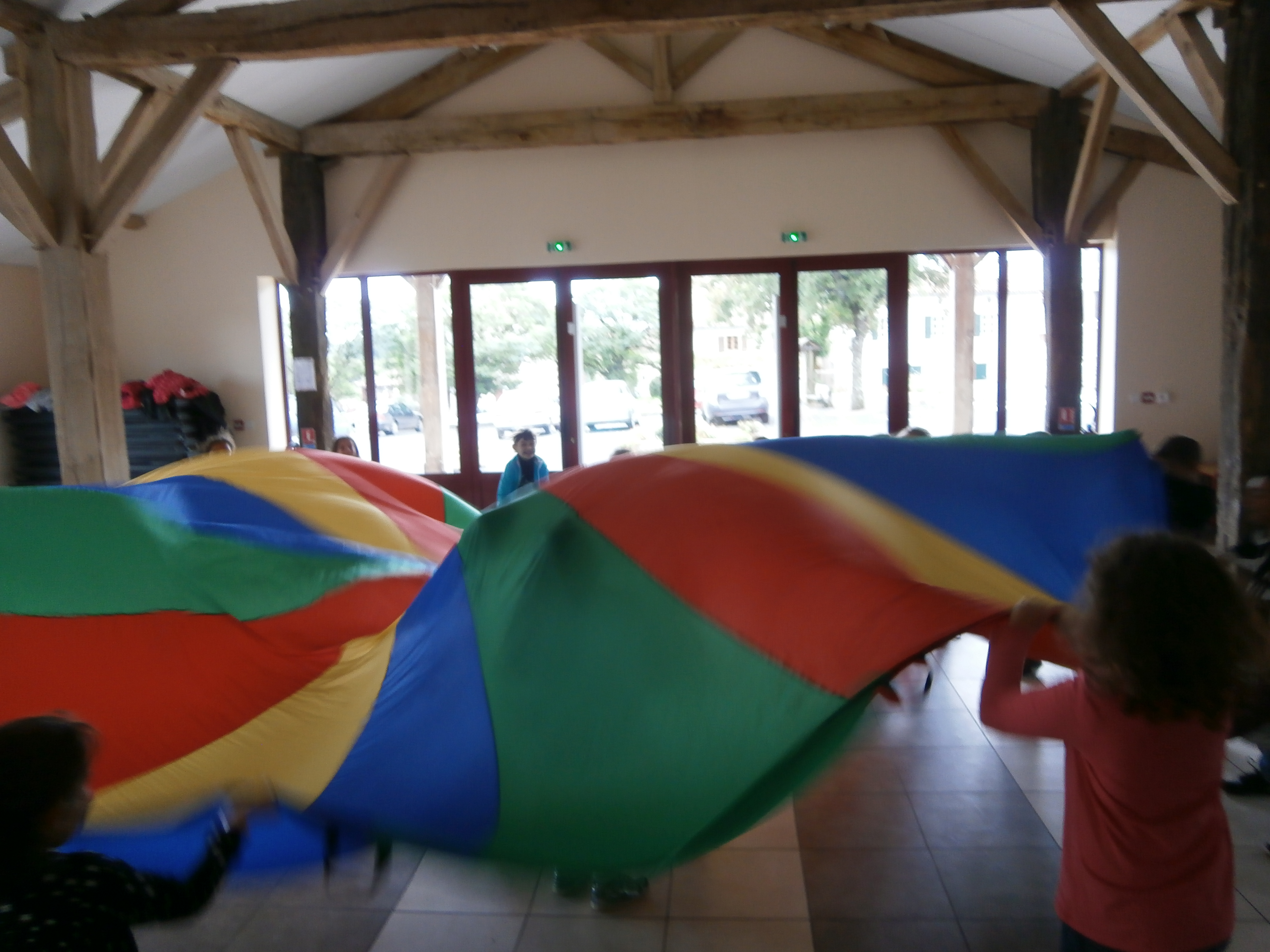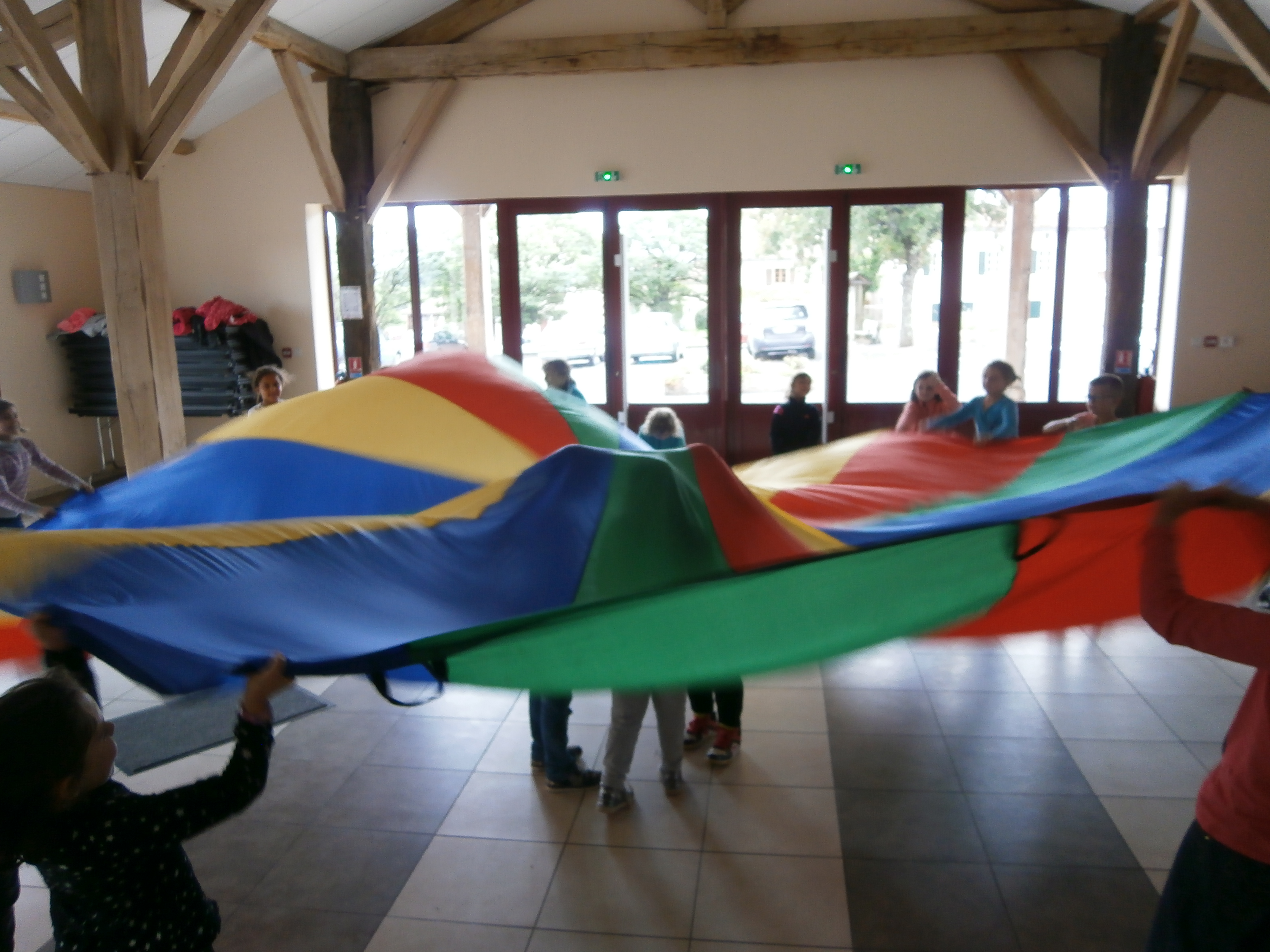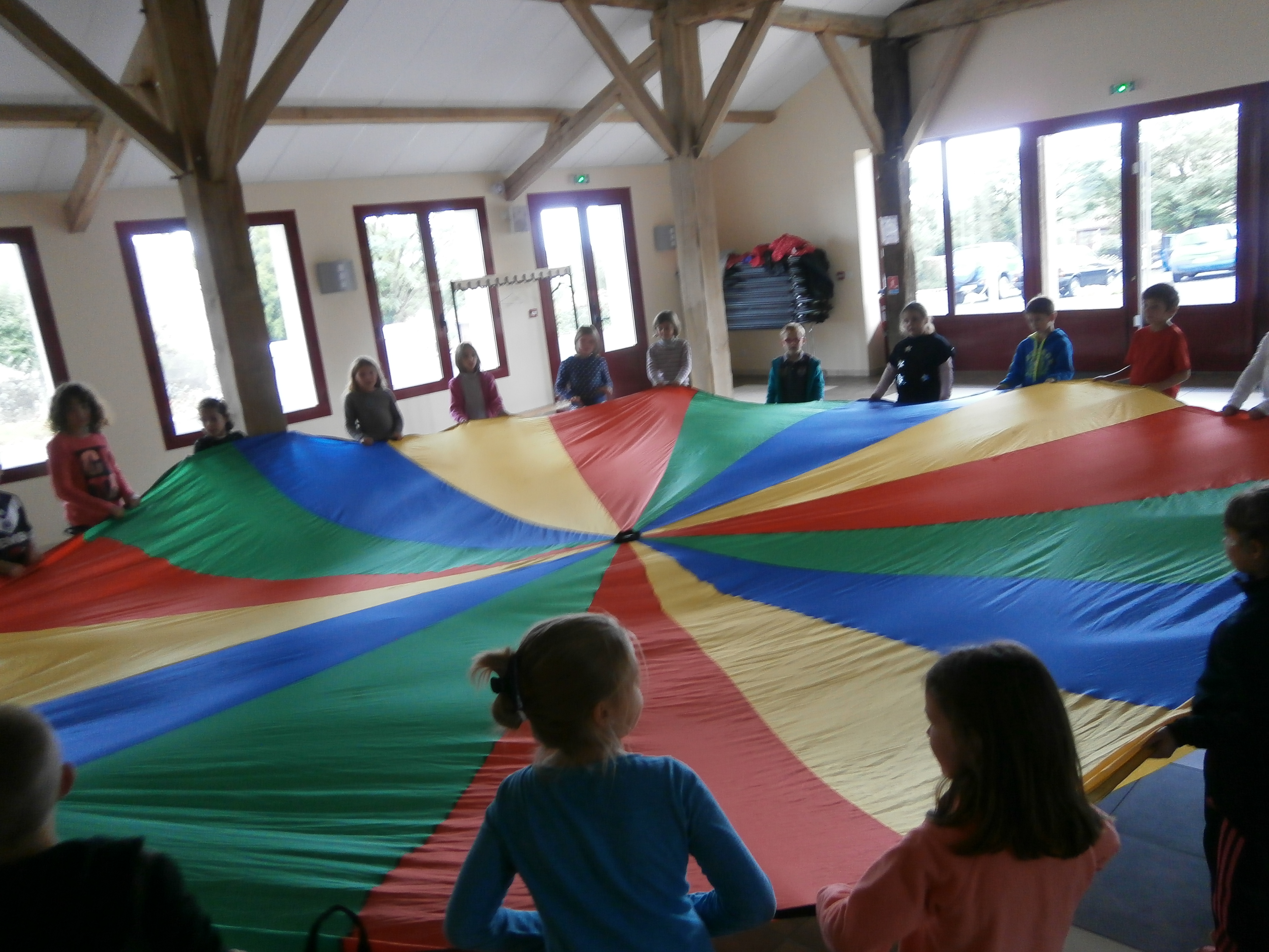 Depuis la rentrée, nous jouons avec un parachute ! C’est une activité qui nous permet de nous coordonner puisqu’il faut que nous réalisions les gestes ensemble pour effectuer les figures et les jeux !